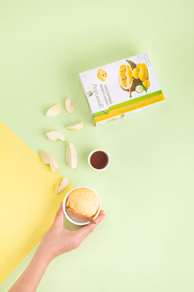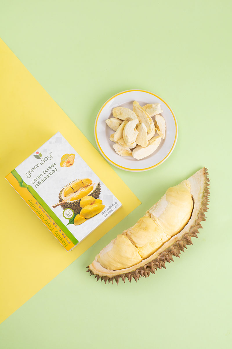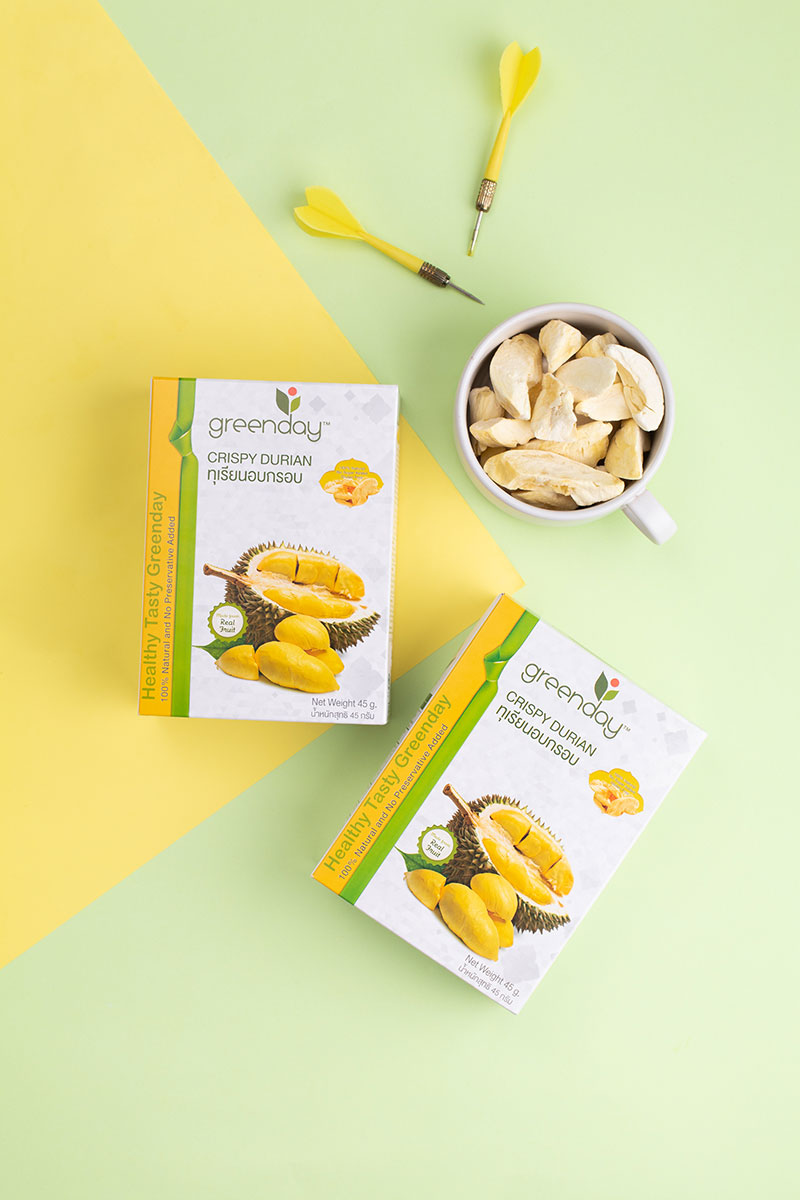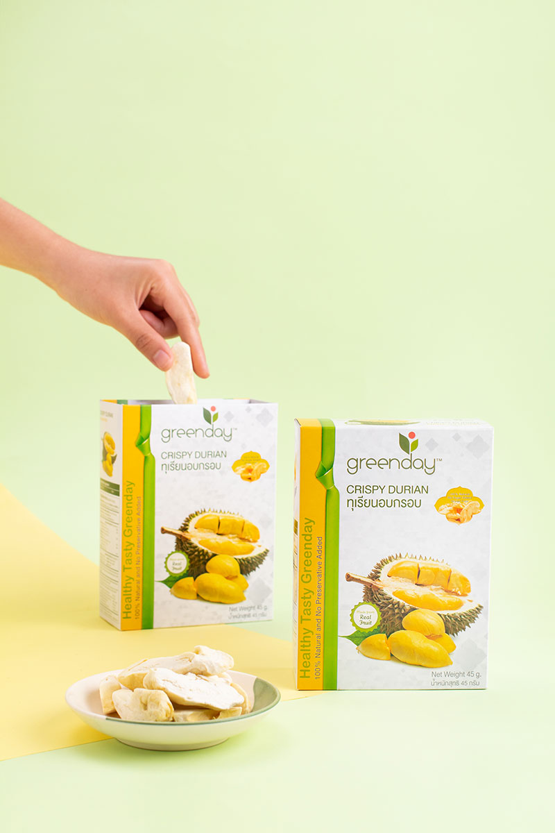 ทุเรียน ราชาแห่งผลไม้ไทยที่ทุกคนติดใจ ในรูปแบบใหม่ หอม กรอบ อร่อย ได้รสสัมผัสที่แปลกใหม่ ทุเรียนกรอบกรีนเดย์อร่อยแตกต่างจากท้องตลาดทั่วไป คือ คงรสชาติความเป็นทุเรียนได้อย่างมีประสิทธิภาพ ลองดูแล้วจะห้ามใจไม่อยู่