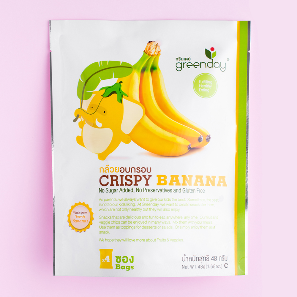 กล้วยอบกรอบ 48 กรัมน้องๆหนูๆบ้านไหนชอบทานกล้วย ซองนี้น่าจะเป็นคำตอบได้ไม่ยาก กล้วยกรอบกรีนเดย์ซองนี้เป็นกล้วยที่ผ่านกรรมวิธี "การอบแห้งแบบแช่แข็งสูญญากาศ(Vacuum Freeze Drying)" ทำให้ได้กล้วยกรอบที่คงรสชาติกล้วยได้ตามธรรมชาติ อร่อย เหมือนกล้วยสดจากธรรมชาติ มี 4 ถุงเล็กในถุงใหญ่ แพ็กใส่กระเป๋าไปทานได้ทุกทีเลย อ่านรายละเอียด